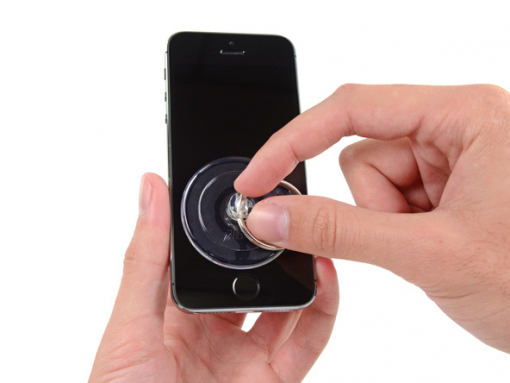 • Hold the iPhone down with one hand and pull up on the suction cup. Separate the front panel (the home button end) only a little from the rear case.