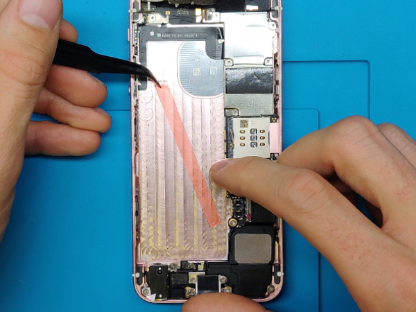 Use the tweezers or the tip of the spudger to unfold the battery adhesive tabs between the battery itself and the headphone jack assembly.