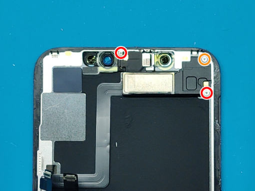 -Pin the light sensor to it's notch in the display. -Again, watch out for the frigle flex cables. -Flip over the speaker. - Secure the speaker with the screws.
