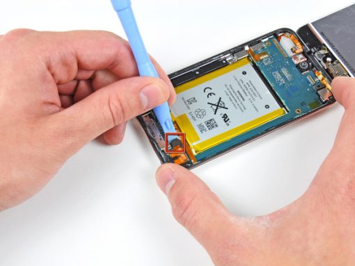 Gently lift the edge of the headphone jack nearest the battery out of its recess by using our opening tool.