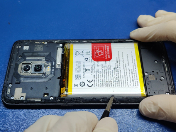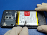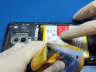 Insert the thin metal opening tool (a.k.a. the iFlex) between the metal frame and the back cover of the phone.
