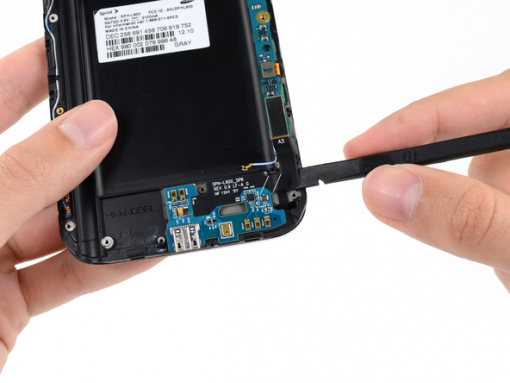 Use a plastic opening tool to lift the battery from the case. You need to insert the tool into the indentation above the battery compartment to do this.
