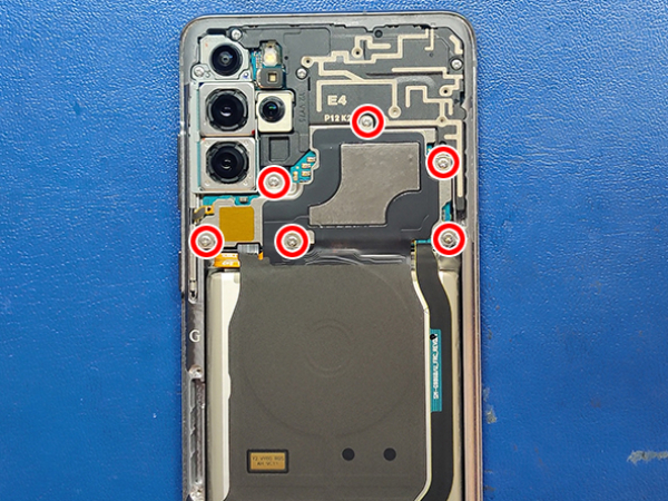 Remove the six 4.0mm Phillips screws securing the Qi charging coil.