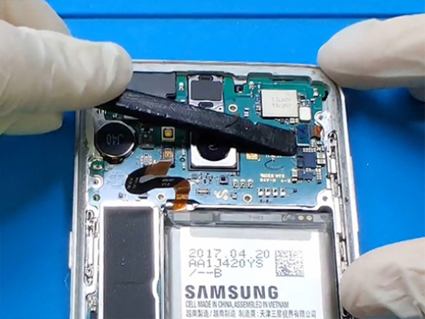 -Take off the plastic cover of the bottom daughter board. -Remove the daughter board's six 2.5mm screws. -Remove the connector from the headphone jack. -Unplug the antenna cable connections. -Gently raise the motherboard while keeping an eye on the nearby connectors. -Remove the motherboard from the device by cutting the cable connecting it to the daughterboard. -At this point, we'll take more components off the phone, like the front camera. -First, take out the front camera. -Use a plastic spudger or tweezers to delicately remove the front camera from the cavity. -Remove the front sensor array using the same procedure and tools. The vibration motor will then be revealed.