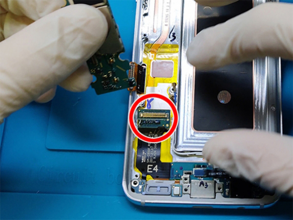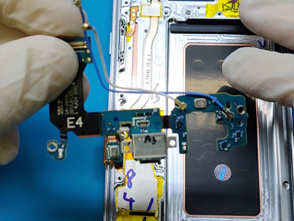 -Insert the daugther board into the newly assembled screen. -Align it with care so that the charging port glides into the middle frame's chamber. -Two antenna cables must be fastened to brackets. -Connect the flat cable to the daughter board after installing the headphone jack. -Now place the vibration motor in the button-shaped recess on the top of the frame. -The front sensor array should then be inserted into the cavity at the upper right as shown in the photograph. -The top left corner of the middle picture is where the front camera is located.