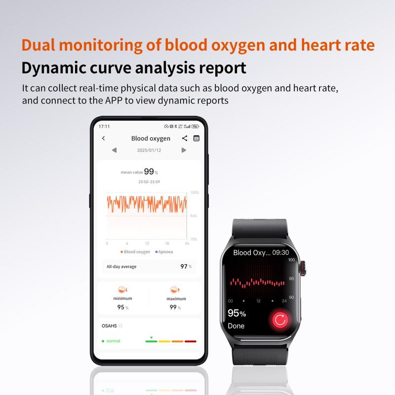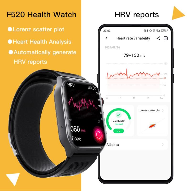 The F520 Air Pump Smart Watch is designed to provide a complete, real-time health monitoring ecosystem using professional-grade technology. Equipped with a Murata piezoelectric microblower, it supports oscillometric blood pressure measurement up to 400 mmHg. Combined with a medical-grade ECG module, cardiac risk assessment, red-light SpO₂ detection, cortisol insights, and 24/7 dynamic heart rate monitoring, this smartwatch helps you understand your body with laboratory-level precision.