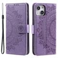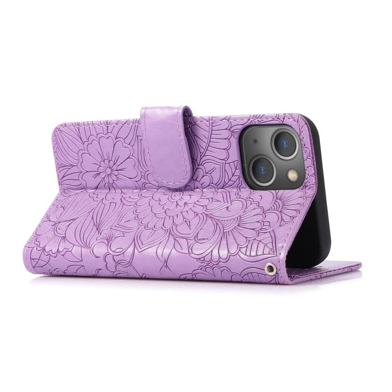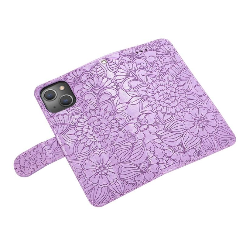 For iPhone 14 Imprinted Flower Pattern PU Leather Phone Cover Stand Shockproof Phone Wallet Case with Strap
