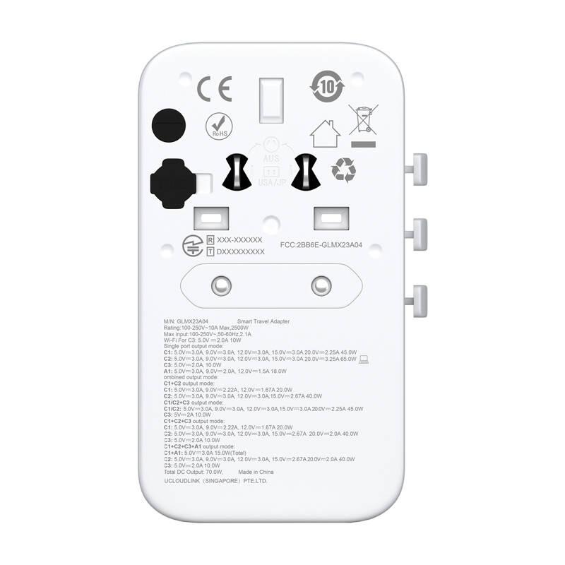 GlocalMe RoamPlug Travel Adapter with 4G/LTE Wi-Fi Hotspot - 70W, EU, UK, JP, CN, US, AUS, 3x USB-C, 1x USB-A