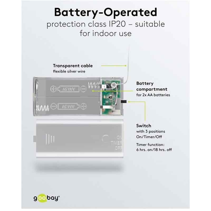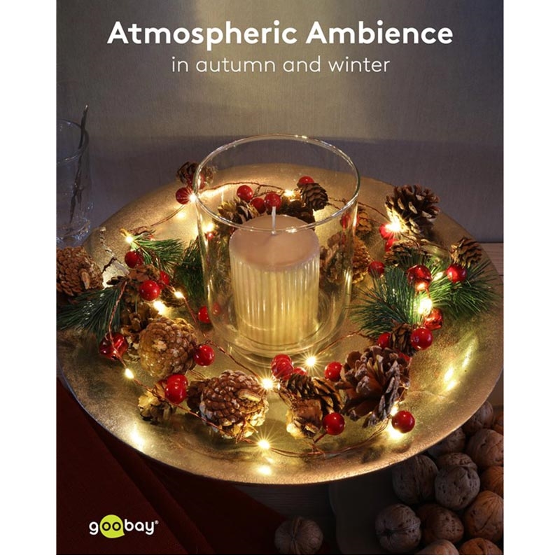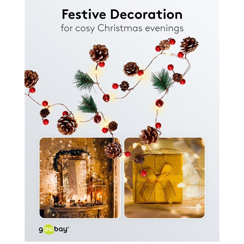 Enhance your home with warm, seasonal charm using these 20-LED Silver Wire Fairy Lights decorated with real pine cones, red berries, bells and fir twigs. Emitting a cosy 3000 K glow, this flexible wire light chain is perfect for decorating living rooms, windows, stair railings, shelves or festive table arrangements. Thanks to the built-in timer, the lights switch on automatically for 6 hours each day, creating effortless ambience throughout the autumn and winter months. Battery operation allows you to place the lights anywhere indoors without needing a power outlet, making them ideal for Christmas décor, restaurant displays and shop windows.