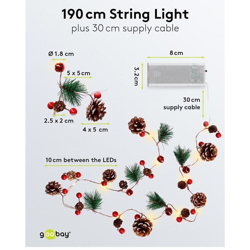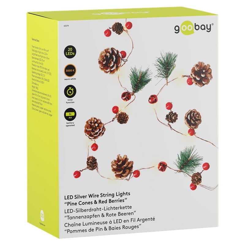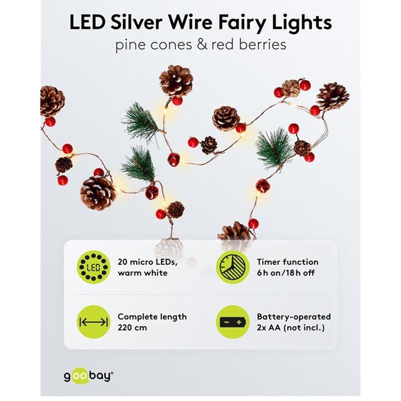 Goobay 20-LED Silver Wire Fairy Lights - Pine Cones & Red Berries