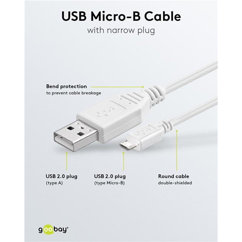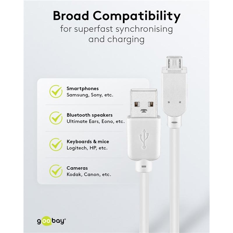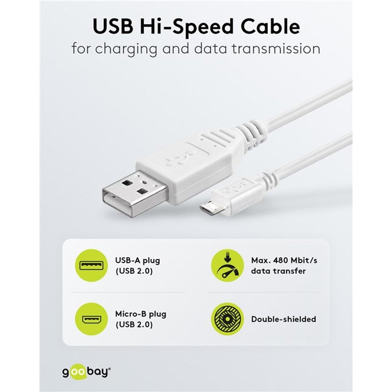 The Goobay USB 2.0 male to microUSB male cable is designed for syncing and charging. This cable allows for data transmissions of up to 480 Mbit/s and offers backwards compatibility to USB 1.1 for added flexibility. The cable length is 1m. The cable is marked with CE and WEEE certifications.