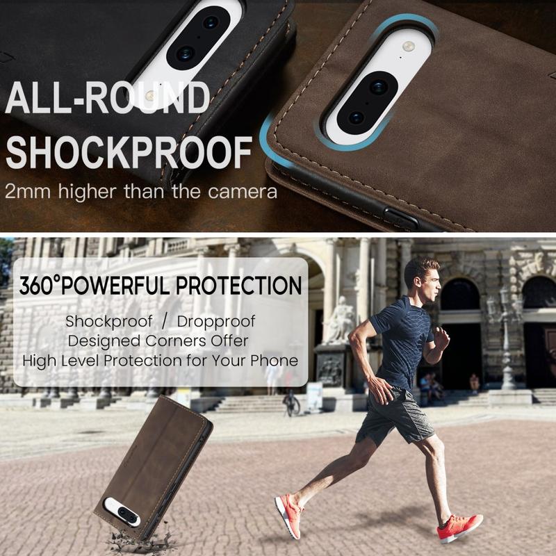 A combination of TPU and polyurethane provides all-around protection for Google Pixel 8a, shielding it from dust, dirt, impacts, scratches, and daily wear. Magnetic attraction keeps the case closed, and clever design enables hands-free usage while watching media content.