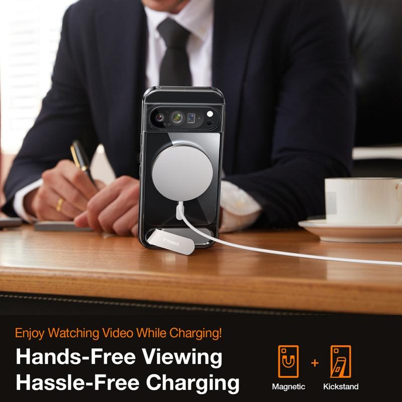 Turn your Google Pixel 9 Pro XL into its own viewing dock without adding pocket bulk. The TORRAS Pstand combines a slim, fold-flat steel stand with an 18 N magnetic ring for rock-solid attachment to MagSafe-style chargers and car mounts, all wrapped in a shock-absorbing TPU shell.