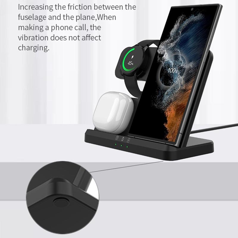 If you are looking for a multifunction wireless charging station for Samsung Galaxy, this 3-in-1 wireless charger is what you need. It is compatible with Samsung Galaxy S22, S21, S20, S10, Ultra, Note, Galaxy Watch 5, 4 and Active Buds, etc.