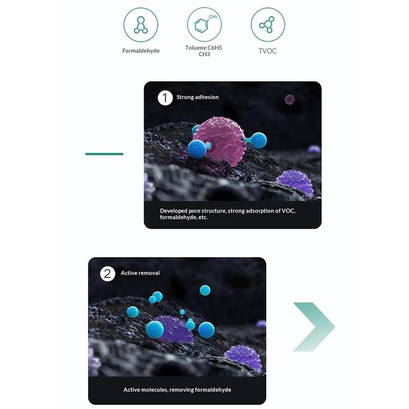 - Catalytic activated carbon helps absorb formaldehyde, toluene, and TVOC compounds
