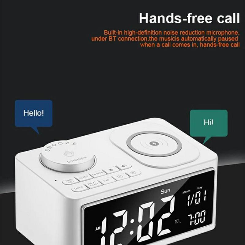 Upgrade your bedside or workspace with the H7 Multifunctional Wireless Charging Bluetooth Speaker Clock Radio. This sleek, all-in-one device combines a wireless charger, Bluetooth speaker, FM radio, and smart alarm clock, offering convenience and efficiency in a compact design.