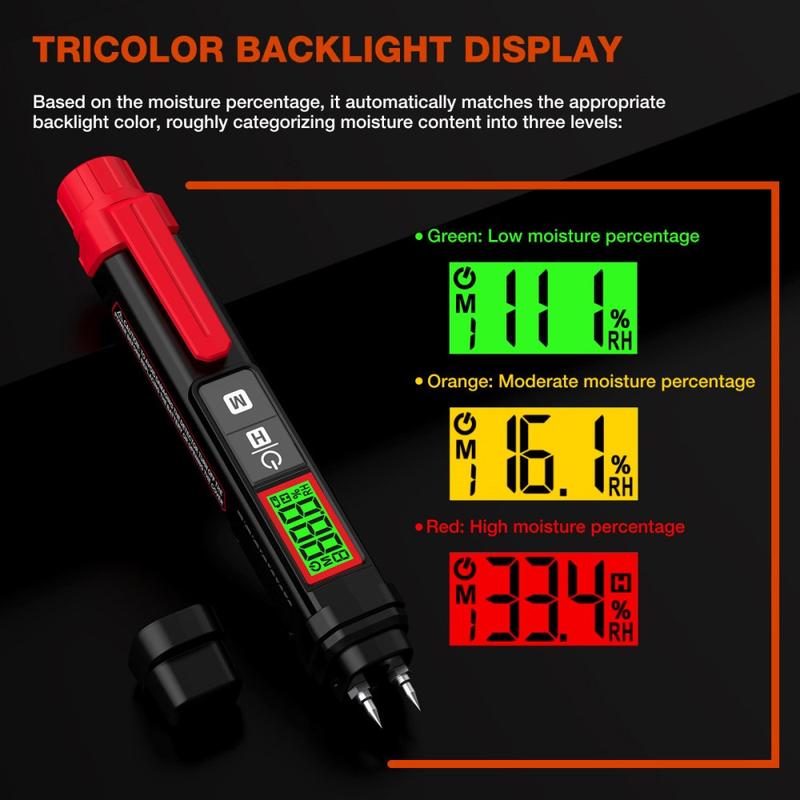 The pen-style body makes it easy to carry and use on site, while the stainless steel probes are built for regular testing across different surfaces. A 3-color backlit LCD display also helps make results easier to read, showing moisture conditions more clearly at a glance even in dimmer environments.