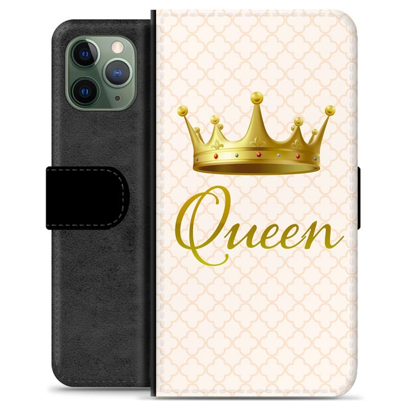The iPhone 11 Pro Premium Wallet Case with the "Queen" design elegantly combines functionality with style. Tailored for those who appreciate a touch of royalty in their accessories, this case features a sophisticated golden crown illustration atop a subtle white and gold patterned background, exuding an air of elegance and luxury.