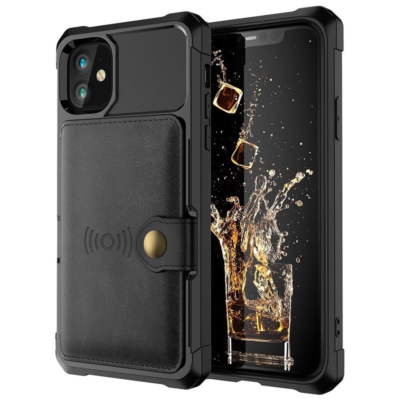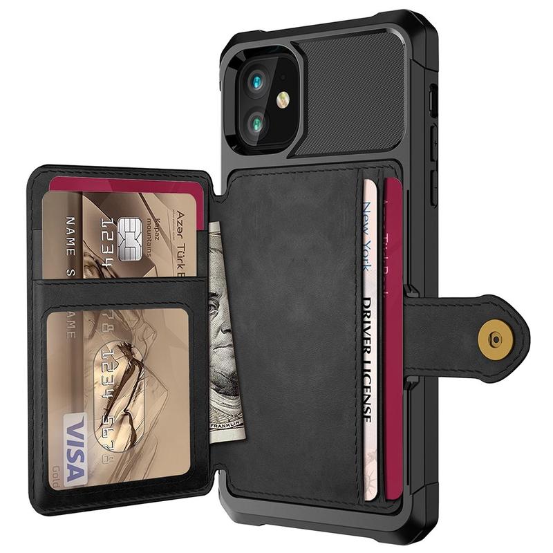 - iPhone 12, iPhone 12 Pro wallet case has a secure snap button closure, wallet design, and several card slots with a cash pocket