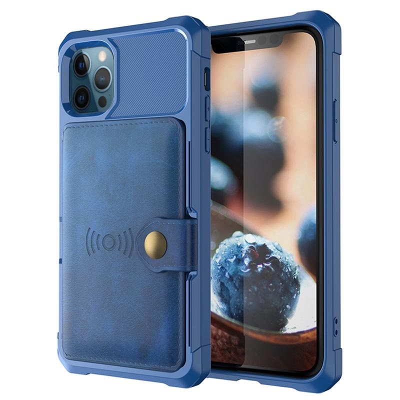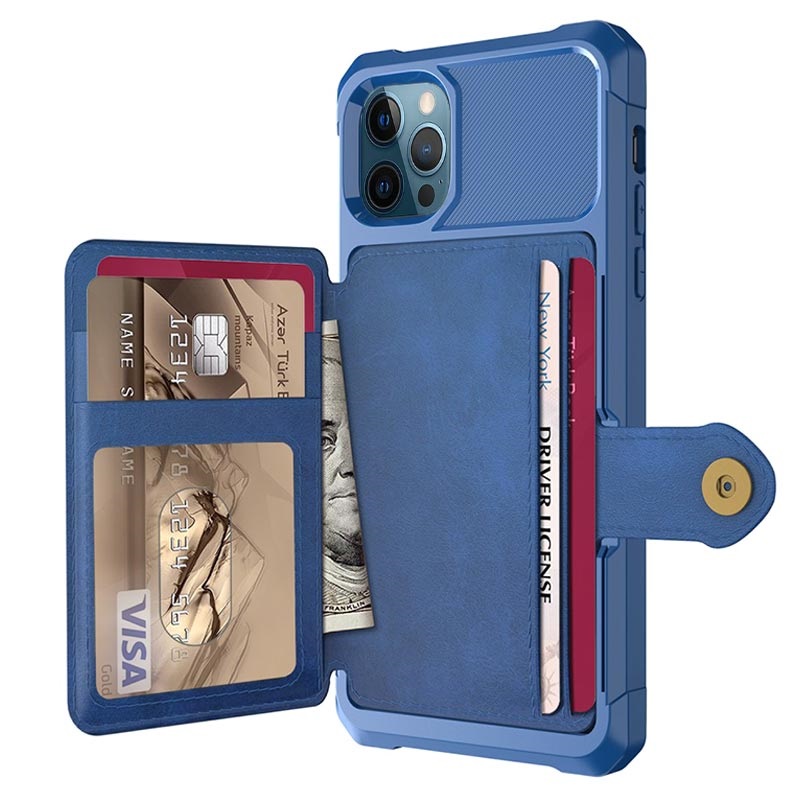 - iPhone 12 Pro Max wallet case has a secure snap button closure, wallet design, and several card slots with a cash pocket