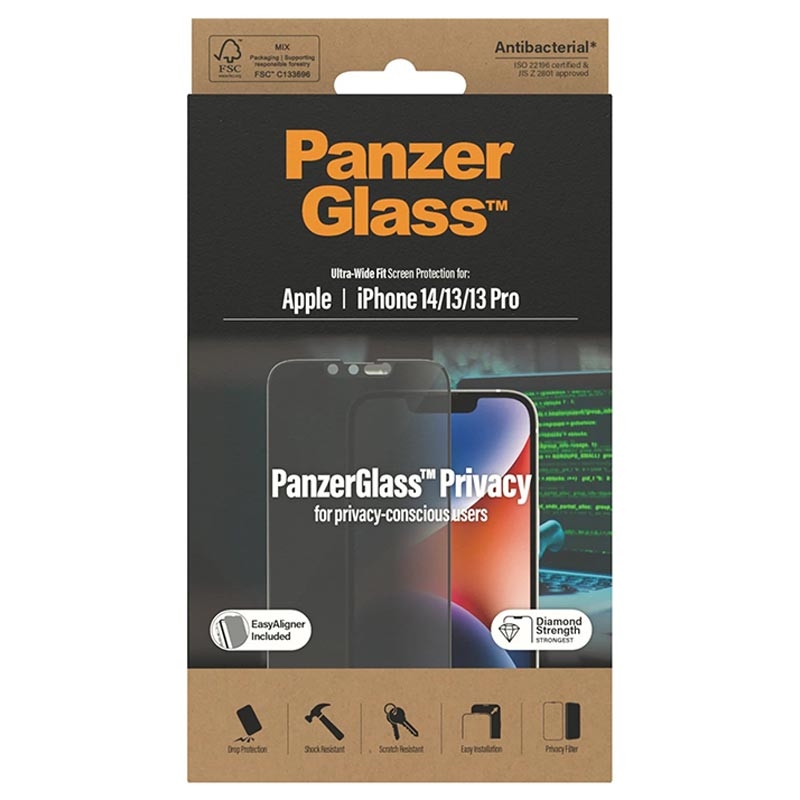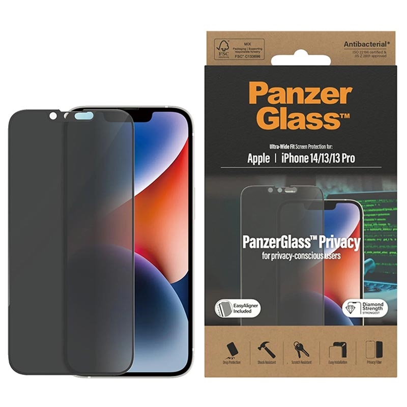 PanzerGlass Ultra-Wide Fit Privacy EasyAligner AntiBacterial Tempered Glass Screen Protector for iPhone 13, iPhone 13 Pro, iPhone 14