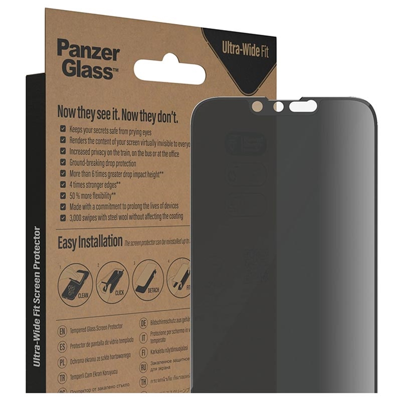 Say goodbye to prying eyes and hello to peace of mind - PanzerGlass Ultra-Wide Fit Privacy tempered glass with EasyAligner for iPhone 13, iPhone 13 Pro, iPhone 14 will keep your private messages or bank details secure. It also provides unbeatable protection against scratches, accidental bumps, and smudges, thanks to its diamond-level tempered glass developed by PanzerGlass.