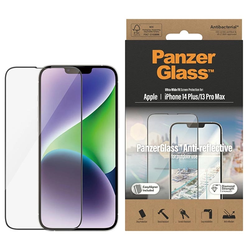 PanzerGlass Ultra-Wide Fit Anti-Reflective EasyAligner AntiBacterial Tempered Glass Screen Protector for iPhone 13 Pro Max, iPhone 14 Plus