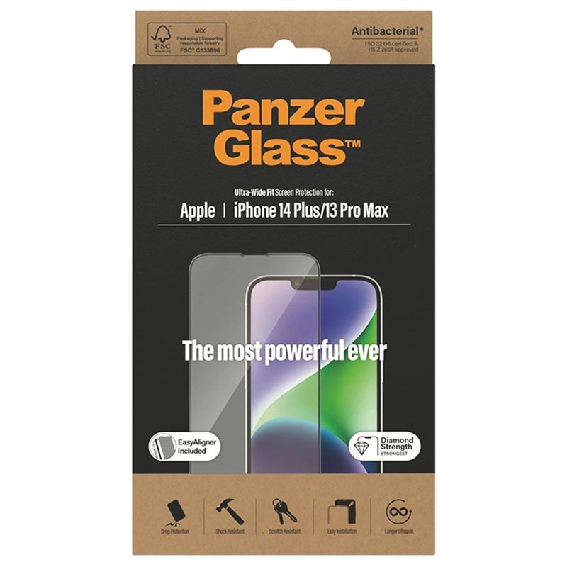 PanzerGlass Ultra-Wide Fit EasyAligner AntiBacterial Tempered Glass Screen Protector for iPhone 13 Pro Max, iPhone 14 Plus