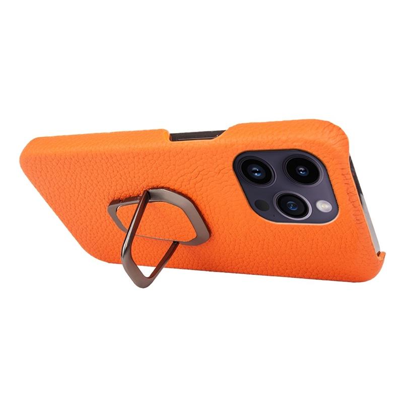 For iPhone 14 Pro Max Genuine Leather + Hard PC Protective Shell Litchi Texture Ring Kickstand Anti-Drop Phone Cover