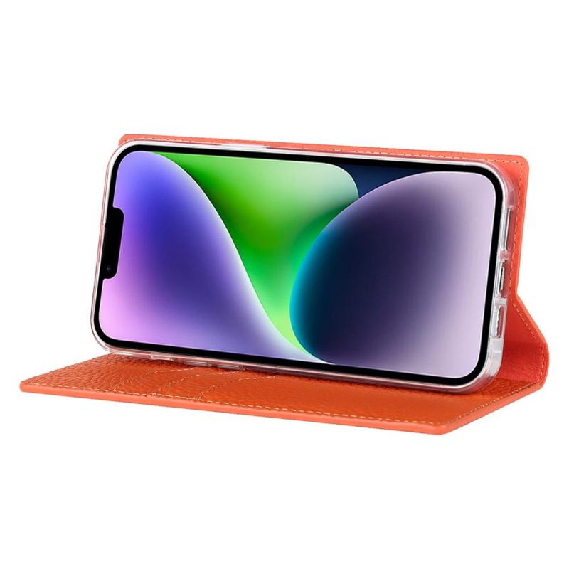 For iPhone 14 RFID Blocking Card Slot Wallet Phone Case Litchi Texture Genuine Leather Stand Auto-absorbed Protective Cover