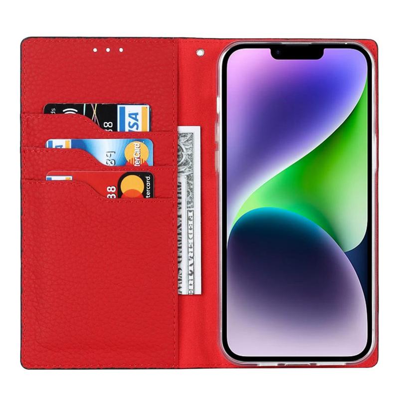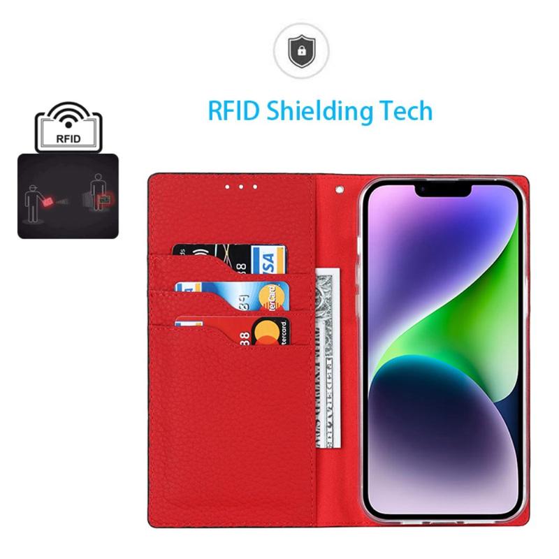 • For iPhone 14 RFID Blocking Card Slot Wallet Phone Case Litchi Texture Genuine Leather Stand Auto-absorbed Protective Cover - Made of genuine leather and TPU material, with litchi texture design, dual protection for your device - Wallet design, easy to organize your cards and cash money for daily use - RFID blocking technology effectively blocks signals and protects your personal information from theft - Supporting stand design is for convenient free-hands use when watching movies or reading - The magnetic auto-absorbed closure keeps all your valuables secure - Raised lip protection keeps the camera lens protected on a flat surface - Provide full body protection against scratches and drops - With a strap to prevent loss and it is convenient to carry