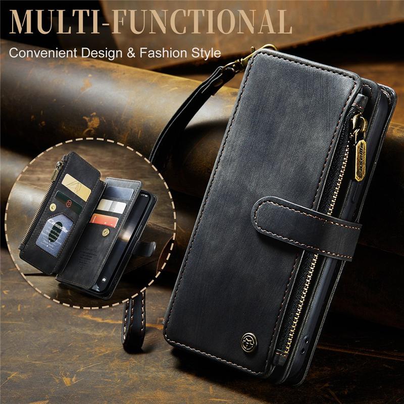 The Caseme C30 multifunctional wallet case for iPhone 15 brings exceptional all-around protection and an exclusive, refined design. This elegant case is made of premium polyurethane, reinforced with a shock-resistant TPU inner cover that snuggles your iPhone 15 perfectly. Meanwhile, the Caseme C30 wallet case is enhanced with numerous card slots, one large money compartment inside, and one outside zipper pocket, all protected by a secure magnetic closure.