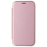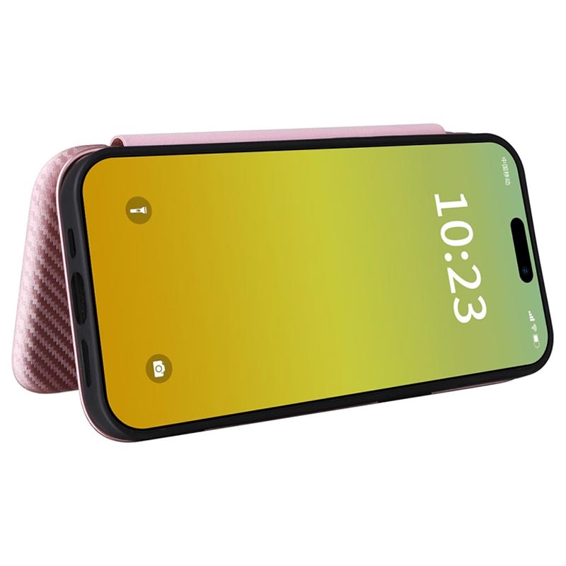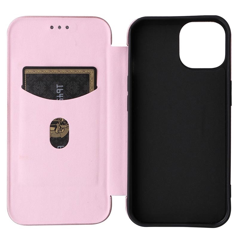 Upgrade your iPhone 15's look with this high-quality carbon fiber textured flip case. The flip case keeps your phone protected from scratches and daily damage. The cover contains a card slot to accommodate your ID or commonly used credit card. It has a ring holder that can be used as a kickstand for hands-free media viewing.