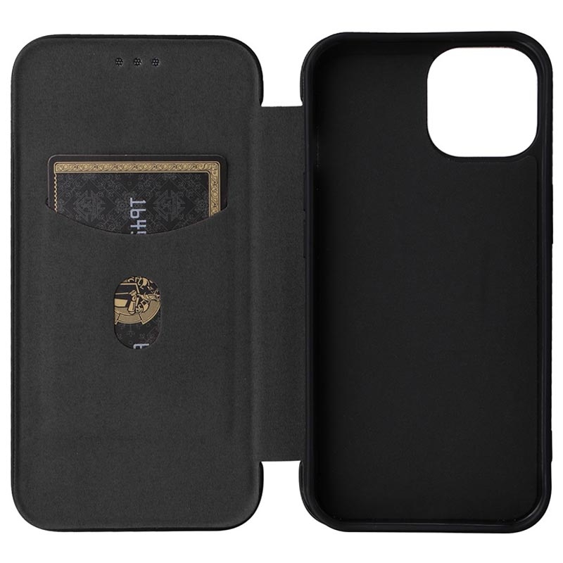 Upgrade your iPhone 15's look with this high-quality carbon fiber textured flip case. The flip case keeps your phone protected from scratches and daily damage. The cover contains a card slot to accommodate your ID or commonly used credit card. It has a ring holder that can be used as a kickstand for hands-free media viewing.
