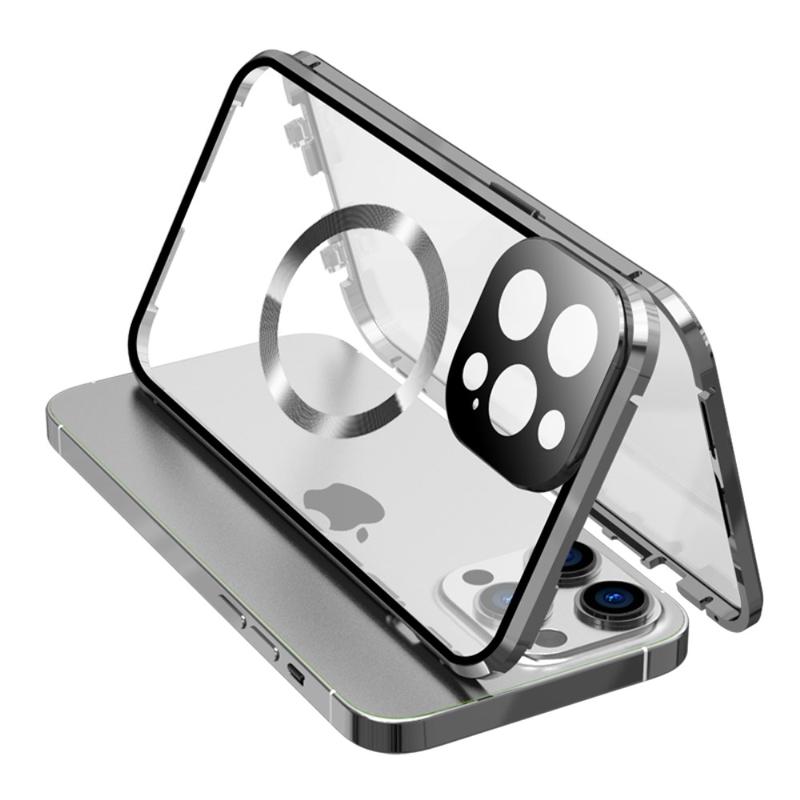 iPhone 15 Pro Max Case Double Sided HD Tempered Glass Phone Cover Compatible with MagSafe - Silver