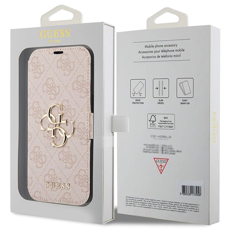 Upgrade your iPhone 15 Pro's protection and style with the Guess 4G Metal Logo book case. Crafted from durable polyurethane with an integrated hybrid cover, this flip case combines elegance with unbeatable protection. The metal 4G logo on the front adds a touch of sophistication to your phone, making it a fashion statement.