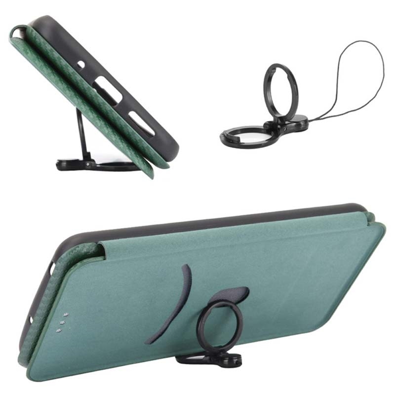 Upgrade your iPhone 15 Pro Max's look with this high-quality carbon fiber textured flip case. The flip case keeps your phone protected from scratches and daily damage. The cover contains a card slot to accommodate your ID or commonly used credit card. It has a ring holder that can be used as a kickstand for hands-free media viewing.