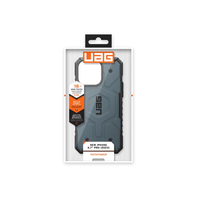 The UAG Pathfinder MagSafe case provides superior, rugged protection for your iPhone 15 Pro Max. This lightweight, impact-resistant hybrid cover meets the military standard for drop protection from a height up to 5,5 meters. For your convenience, this iPhone 15 Pro Max case from UAG features an integrated magnet compatible with MagSafe chargers, holders, and other accessories.