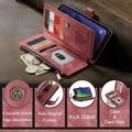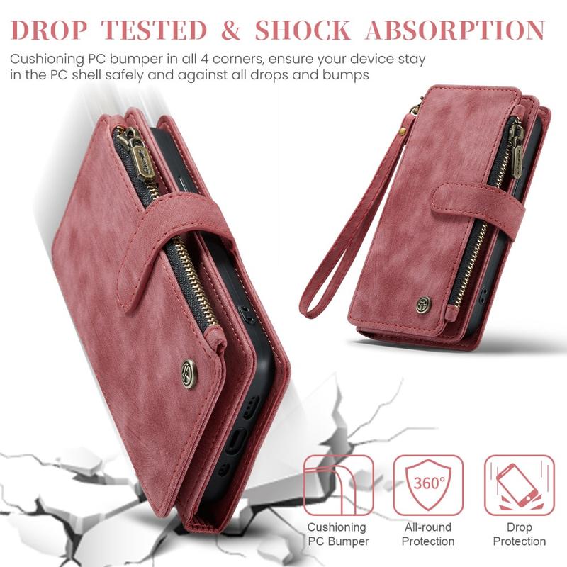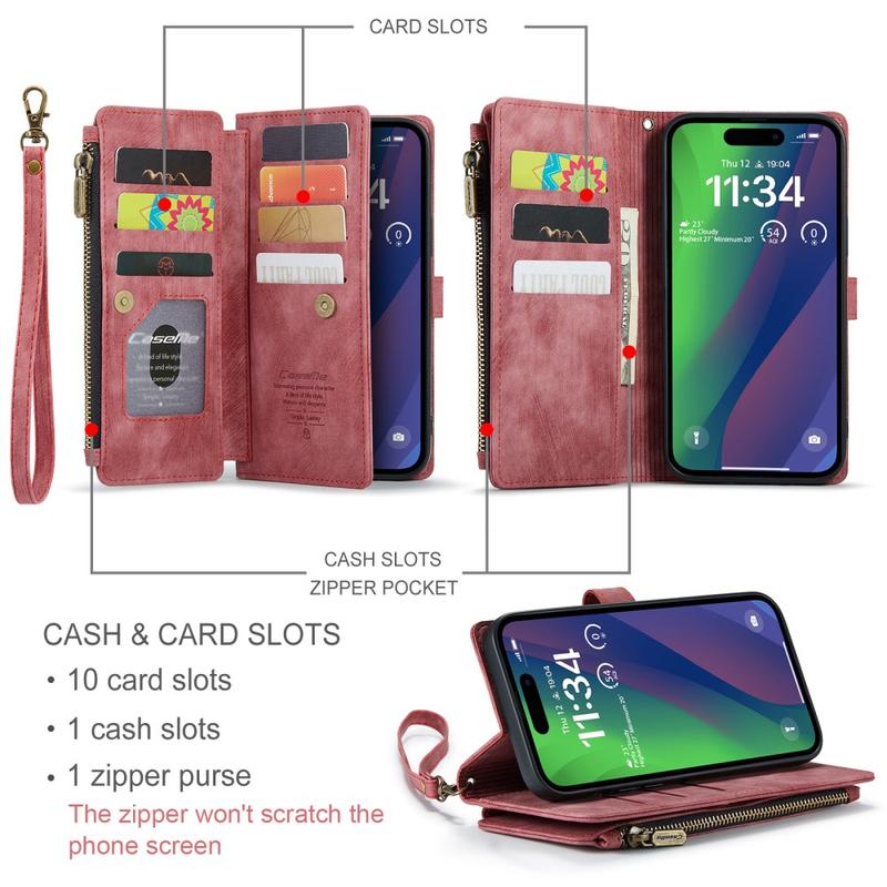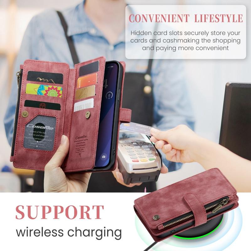 The Caseme C30 multifunctional wallet case for iPhone 16 Plus brings exceptional all-around protection and an exclusive, refined design. This elegant case is made of premium polyurethane, reinforced with a shock-resistant TPU inner cover that snuggles your iPhone 16 Plus perfectly. Meanwhile, the Caseme C30 wallet case is enhanced with numerous card slots, one large money compartment inside, and one outside zipper pocket, all protected by a secure magnetic closure.