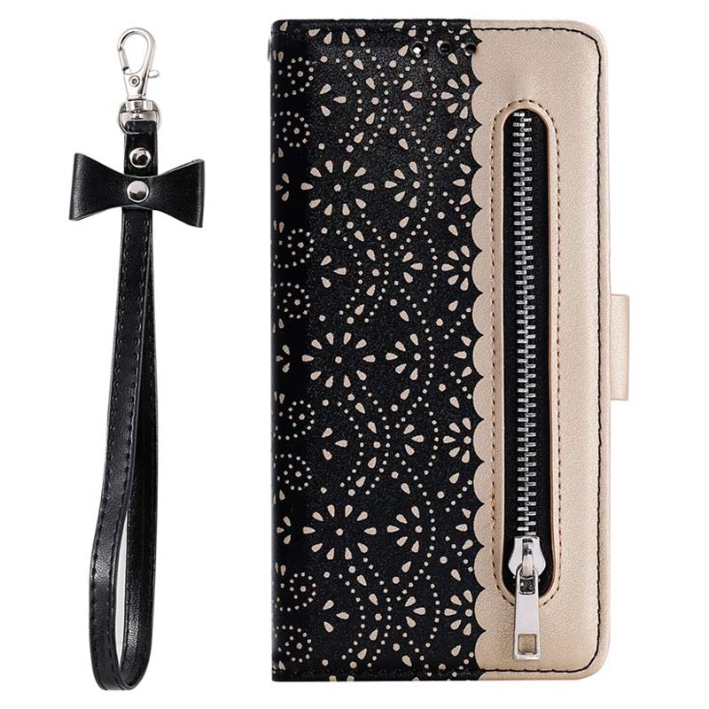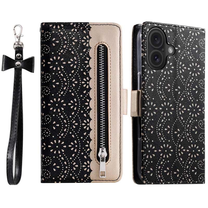 This incredibly stylish wallet case with lace pattern protects your iPhone 16 Plus from damage, and front zipper pocket lets you store paper money and coins.