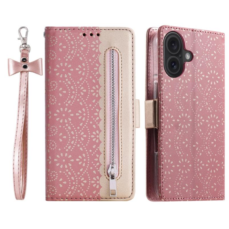This incredibly stylish wallet case with lace pattern protects your iPhone 16 Plus from damage, and front zipper pocket lets you store paper money and coins.