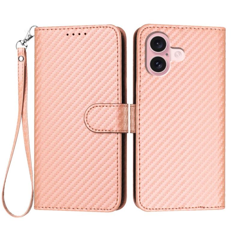 iPhone 16 Premium Wallet Case with Strap - Carbon Fiber Texture - Carbon Pink