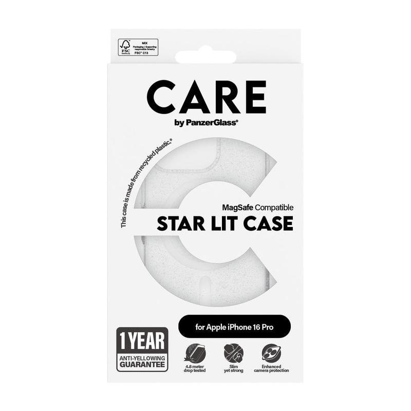 Shine on the red carpet or in unforgettable moments with the CARE by PanzerGlass Star Lit Case, designed for iPhone 16 Pro. This eco-friendly, recycled plastic case offers 4.8-meter drop protection, MagSafe compatibility. Its military-grade standards ensure robust protection, while enhanced camera protection keeps your photos flawless. Fashion-forward yet functional, this case reflects your style and sustainability values.