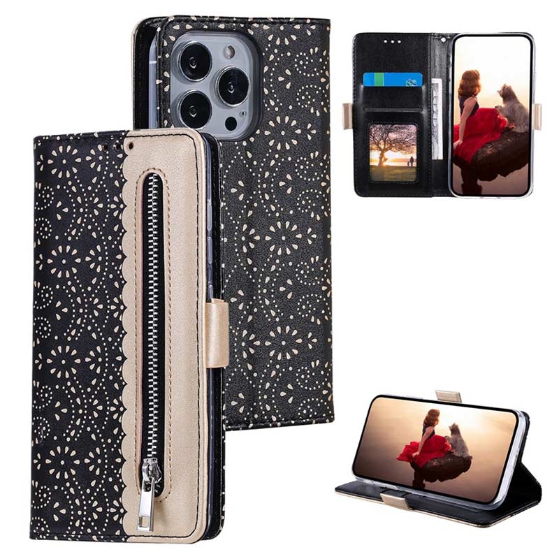 This incredibly stylish wallet case with lace pattern protects your iPhone 16 Pro from damage, and front zipper pocket lets you store paper money and coins.