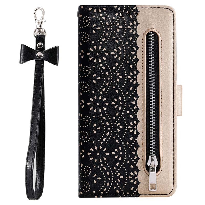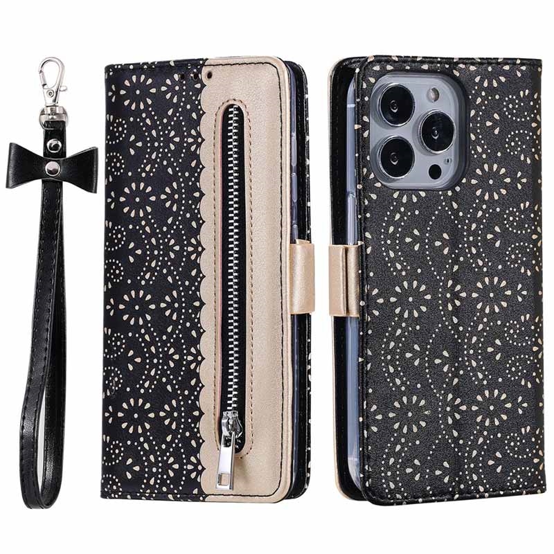This incredibly stylish wallet case with lace pattern protects your iPhone 16 Pro Max from damage, and front zipper pocket lets you store paper money and coins.