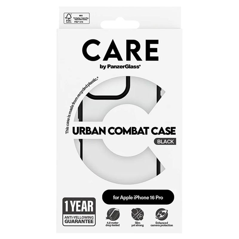 The CARE by PanzerGlass Flagship Case for iPhone 16 Pro Urban Combat with Clear Frame is designed for those who need robust protection without sacrificing style. Made from 100% recycled plastic, this case is built to withstand drops up to 4.8 meters and offers enhanced scratch and shock resistance. It is also compatible with wireless charging and comes with a 1-year anti-yellowing guarantee.