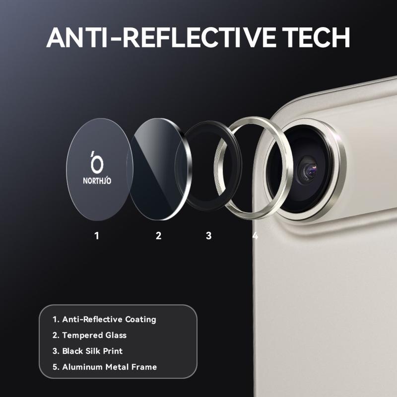 Upgrade your iPhone Air with the Northjo camera lens protector. Featuring a CD veins aluminum ring, it adds a sleek, modern touch to your iPhone Air while offering robust protection. The 9H tempered glass safeguards against scratches, impacts, and dust, ensuring your camera lens stays crystal clear. With easy, tool-free installation, you can enhance your iPhone Air durability and aesthetics in seconds.