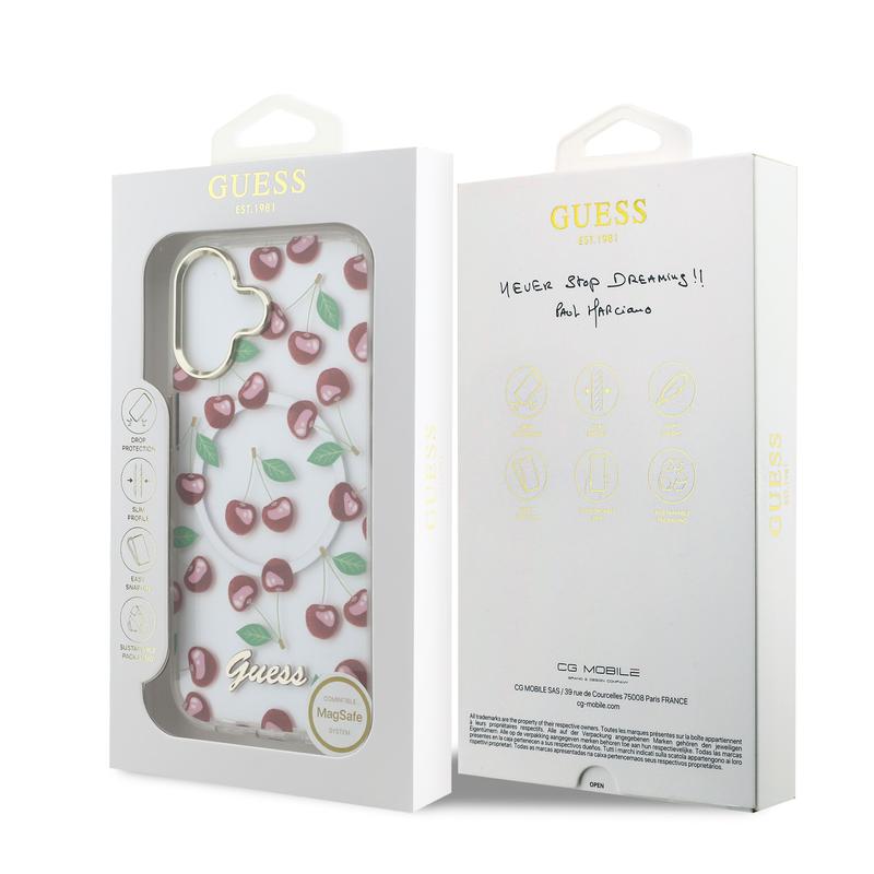 Add a touch of glamour to your everyday protection with the Guess IML Glitter Cherry MagSafe Hybrid Case for iPhone 17. Designed for fashion-forward users, this premium back cover combines durable PC with flexible TPU to deliver reliable protection while maintaining a slim and elegant look. The glitter cherry design with the iconic Guess logo transforms your phone into a stylish statement piece.