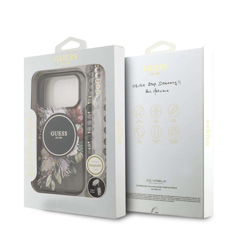 The Guess IML Flowers Strap MagSafe Case for iPhone 17 Pro perfectly combines fashion and functionality. Designed for those who appreciate elegance with everyday practicality, this premium case features a floral motif and the iconic Guess logo set in a golden circle. Made from durable polycarbonate and flexible TPU, it ensures reliable protection while maintaining a sleek, comfortable grip. With built-in MagSafe compatibility and an included pearl-style wrist strap, this case enhances both your phone’s style and usability.