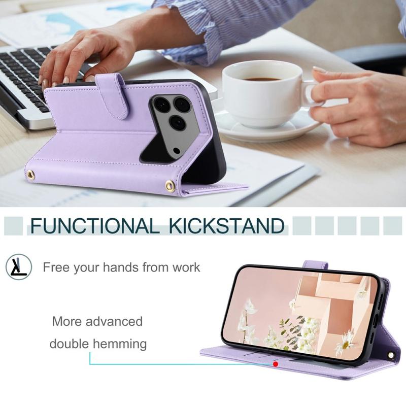 Protect your iPhone 17 Pro with this luxurious quilted wallet case. Constructed with TPU material coated with PU leather, this case is scratch-resistant and anti-fingerprint, keeping your phone looking stylish and sleek. The stitching line forms a rhombus grid pattern, adding a fashionable and beautiful touch to the case. The raised edge of the camera and screen offers effective protection against scratches, while the precise cutouts provide full access to all buttons, ports, and other features. The wallet design allows for easy storage of essential cards and cash. With added protection against scratches, impact, drops, and daily damage, this case also comes with a shoulder strap and wrist strap for added convenience.